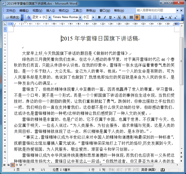 每年的3月5日就是“学雷锋纪念日”,雷锋精神是中华民族传统美德的一种积淀,是一种随着时代进步而不断发展的与时俱进的精神,下面分享的是2015年3月学雷锋日国旗下讲话稿,doc格式文档,需要的朋友可以点击下面的地址免费下载此份文档。