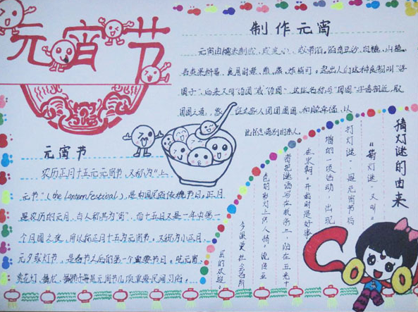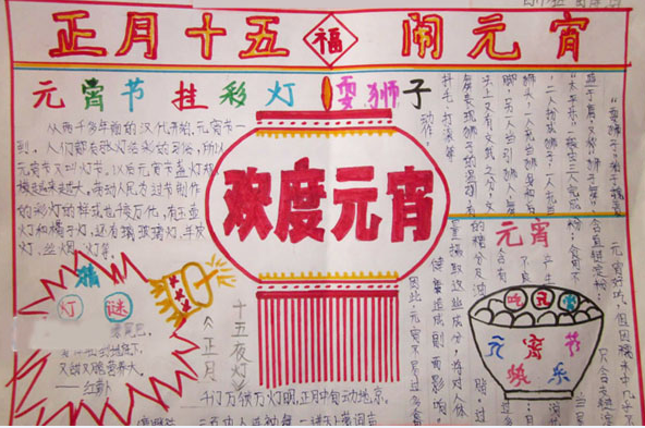 对于即将到来的元宵节,想要办出一个优秀的元宵节手抄报,可以多看看一些好的元宵节手抄报图片。今天小编和大家分享的是2015年小学生元宵节手抄报精选,希望这个元宵节黑板报资料大家会喜欢,有需要的朋友可立即下载此文档。