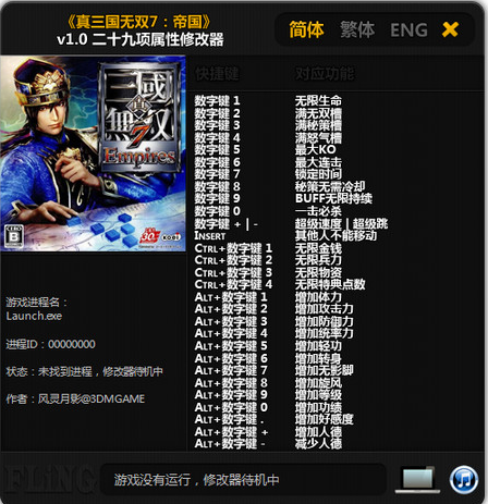 其实在玩《真三国无双7帝国》的很多时候会遇到太多的困难,这时就需要真三国无双7帝国二十九项修改器,它能够让我们在游戏里面获得满怒气槽、增加功绩、增加好感度等二十九种功能,从而更轻松的在里面进行游戏!