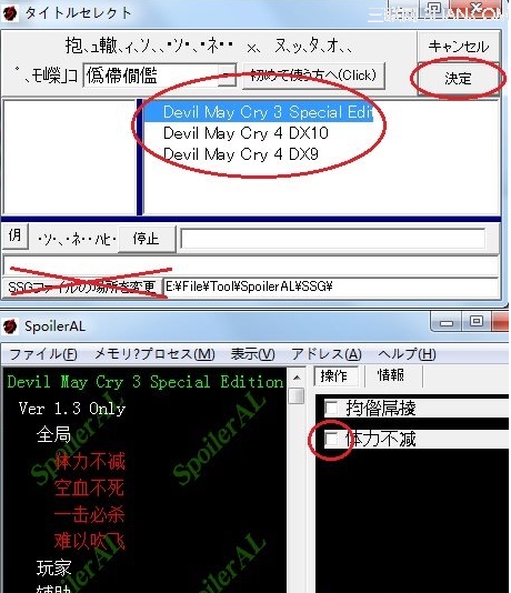 注意spoileral虽然是一款日文修改器,但我写的SSG文件是简体中文的,所以直接在中文环境运行修改器即可,不要使用语言区域转换程序,那样反而会使选项变成乱码。如果有人实在无法正常显示修改选项的,可以自己把SSL文件里面的汉字说明都改成英文,注意不要改到代码就行了。如果在选定项目时遇到提示[Not Defined Error!],这是修改器没有检测到目标程序的意思,请注意修改器对应的游戏版本,目前鬼泣3只支持1.3版,鬼泣4有DX9和DX10两种,注意区分。另外如果需要关掉游戏重新运行的话,修改器也要跟着关掉重新打开。