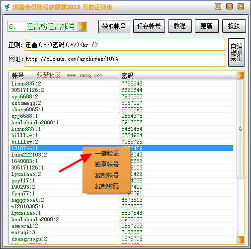 2、右键可以在线一键验证迅雷会员帐号和密码,实时可知帐号和密码是否正确,本软独创。还可以右键单独复制帐号和密码。