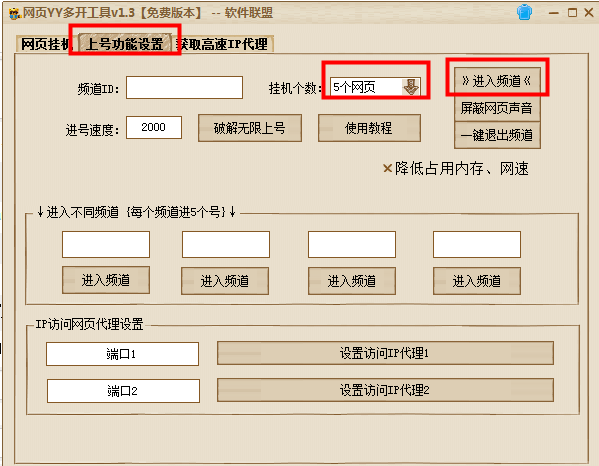 第一步:打开本软件,点击软件界面的上号功能设置,选择挂机个数填写频道ID,再点击进入频道。
