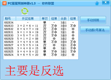 PC蛋蛋预测神器是一款简单好用的PC蛋蛋预测软件。该软件能科学有效的预测开奖结果,准确率非常之高。同时,软件支持手动预测,绝对给力。欢迎下载体验!