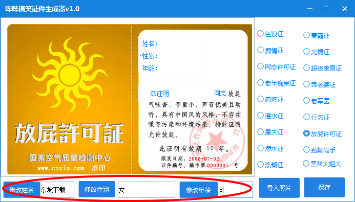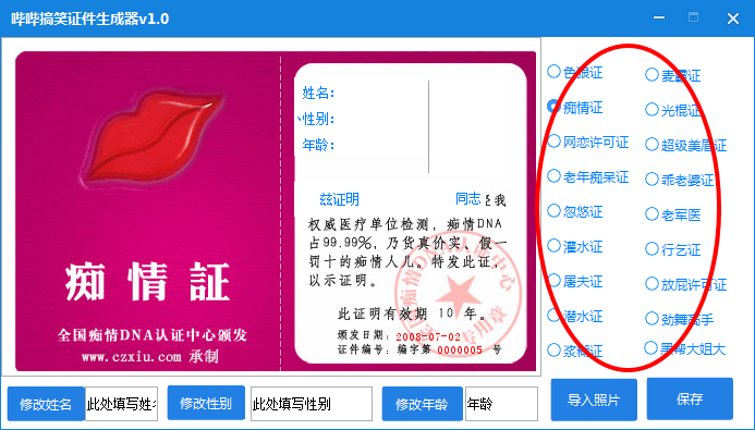 哔哔搞笑证书生成器可以很方便的制作各种搞笑证件。如色狼证、网恋许可证、老年痴呆证等,软件内置模板有限,但是可自行导入图片,完全自定义证书内容,绝对爆笑!欢迎下载体验!