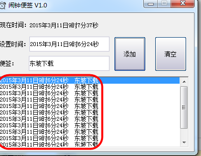 信息将会在列表框显示,当所定时间与系统时间相一致时,软件会弹出信息框,提示信息为所填便签。