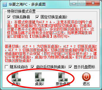 ALT + A :特别切换模式,切换后可以将音量设置为静音!如果不启用【固定切换至桌面2】的话将会在桌面一和桌面二之间进行切换,如果当前桌面为原桌面或桌面一的时候将切换到桌面二。如果是桌面二的话将切换为桌面一。在【切换后静音】启用的情况下,在切换完桌面后会静音(仅在特别切换模式下才可静音!)。