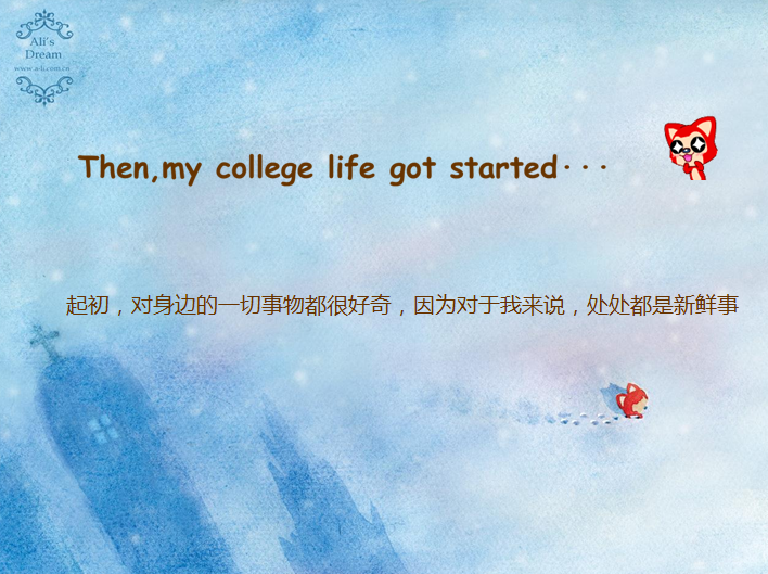 高中毕业后,大学的生活总是令人向往,大学有时候也是一共美好的回忆,下面分享的是我和我的大学生活ppt,主要讲诉的是从离开家乡踏上火车开始自己的大学生活,大学的丰富多彩的课外生活,每次考试前的紧张,幻灯片采用了卡通的图片,看起来非常的可爱有趣。
