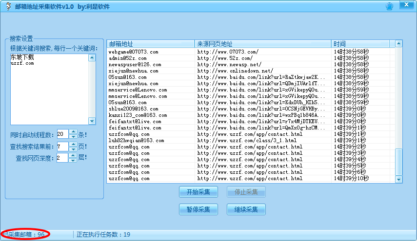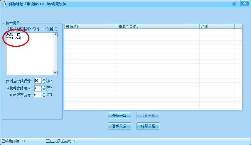 邮箱地址采集软件2015支持同时采集多个关键词,多线程采集,稳定高效!软件界面美观、操作简单,最重要的是完全免费,适合营销人员使用,欢迎下载体验!