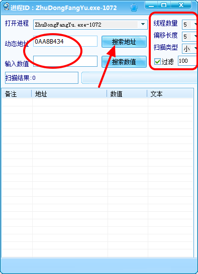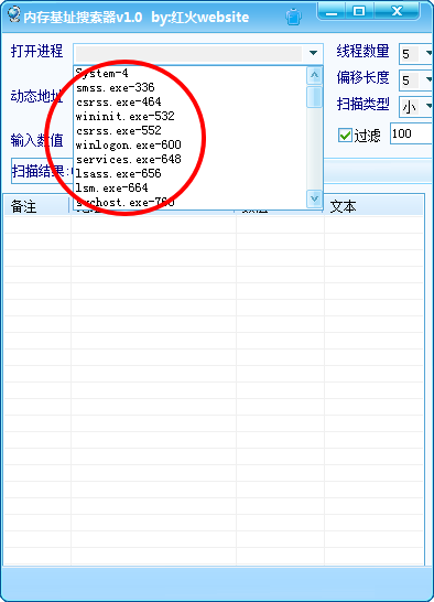1、打开红火内存基址搜索器,在进程列表内选择游戏进程