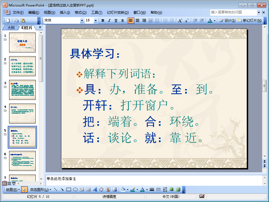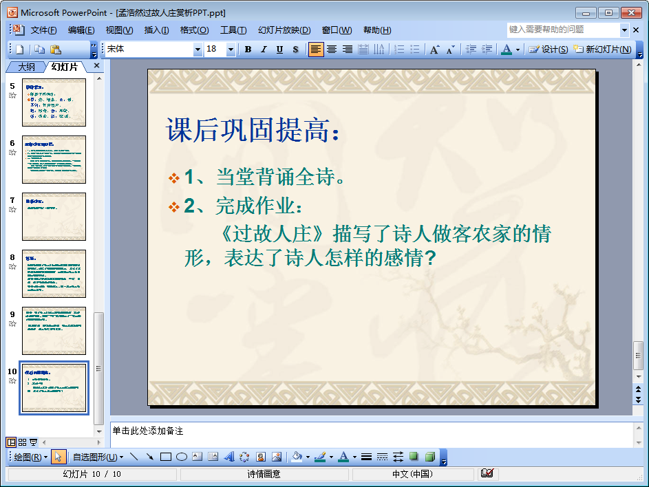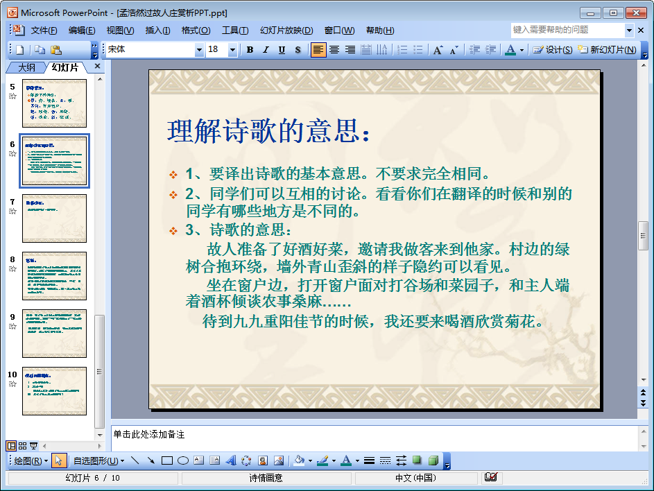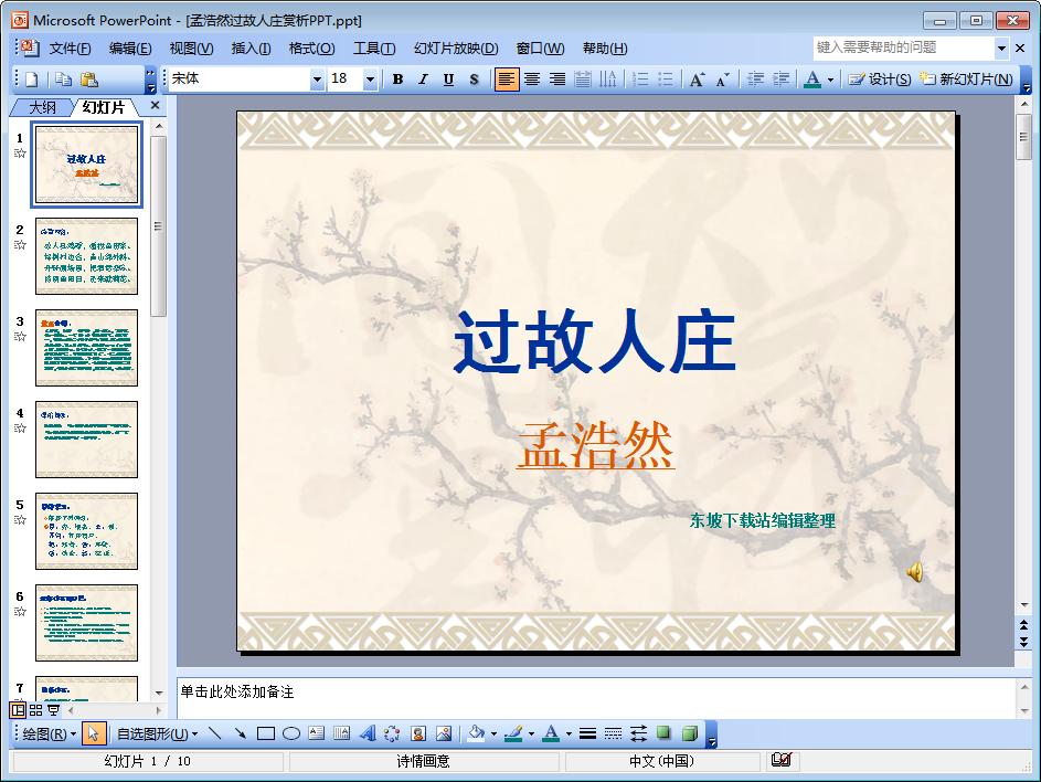 本节内容小编为大家精选带来的是孟浩然过故人庄赏析PPT,该ppt文档共10页,如果你需要一份与此内容相关的古诗讲解ppt,那么希望这份过故人庄ppt能对你有所帮助!欢迎有需要的朋友点击本文下方相应的下载地址下载使用这份古诗讲解ppt之孟浩然过故人庄赏析。