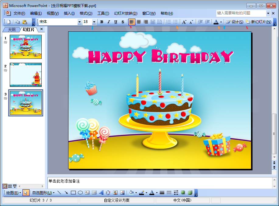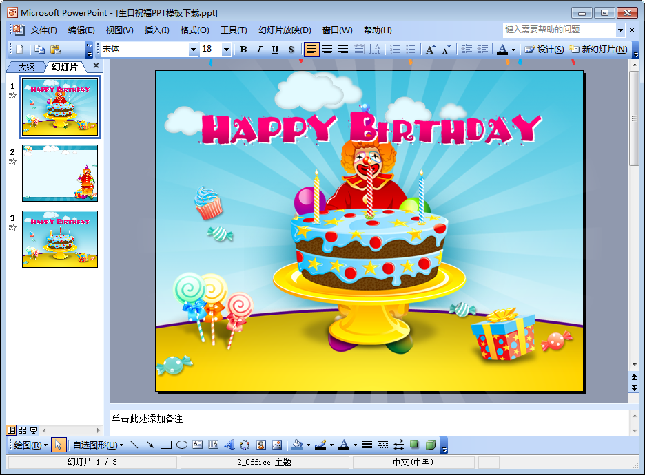 该生日快乐(Happy Birthday)PPT模板虽然只有3页,但它的图片和设计却非常巧妙,而且独具心意,如果你需要一份生日快乐ppt模板或是一份有happy birthday字样的ppt模板,那么不妨就下载使用该ppt模板素材吧!该生日快乐(Happy Birthday)PPT模板完全免费哦!欢迎有需要的朋友下载使用!