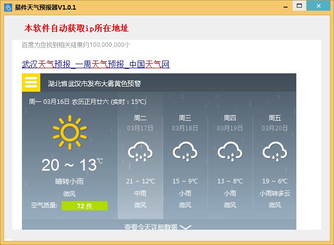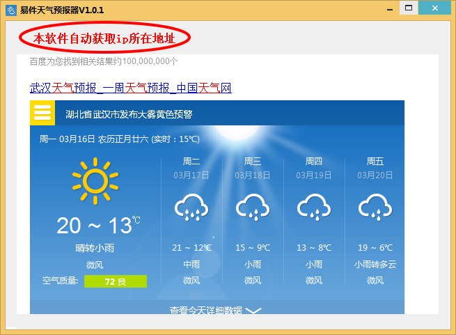 1、打开易件天气预报器,自动根据当前IP获取城市天气预报