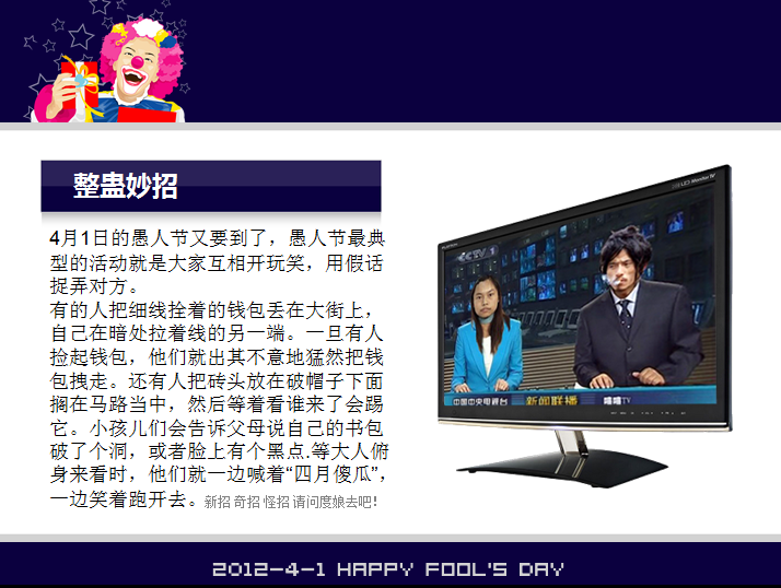 3月份已经过半了,马上就是4月1日愚人节了,不知道大家是否被整了呢?下面分享的是愚人节整蛊无极限ppt,幻灯片整体以蓝色为背景,搭配一个滑稽的小丑,喜欢这个愚人节ppt模板的朋友们赶紧下载吧。