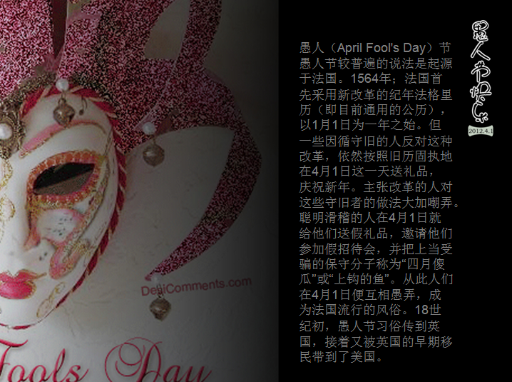 愚人(April Fool's Day)节 愚人节较普遍的说法是起源于法国。1564年;法国首先采用新改革的纪年法格里历(即目前通用的公历),以1月1日为一年之始。但一些因循守旧的人反对这种改革,依然按照旧历固执地在4月1日这一天送礼品,庆祝新年。主张改革的人对这些守旧者的做法大加嘲弄。聪明滑稽的人在4月1日就给他们送假礼品,邀请他们参加假招待会,并把上当受骗的保守分子称为“四月傻瓜”或“上钩的鱼”。从此人们在4月1日便互相愚弄,成为法国流行的风俗。18世纪初,愚人节习俗传到英国,接着又被英国的早期移民带到了美国。