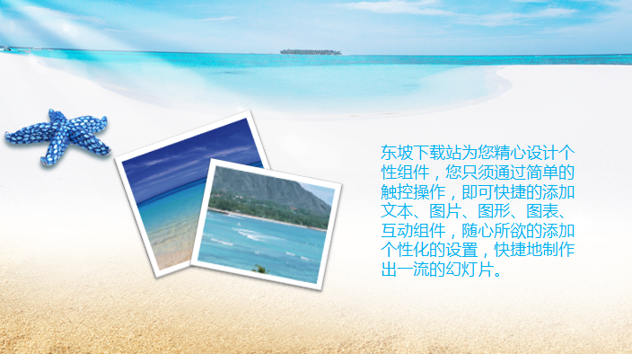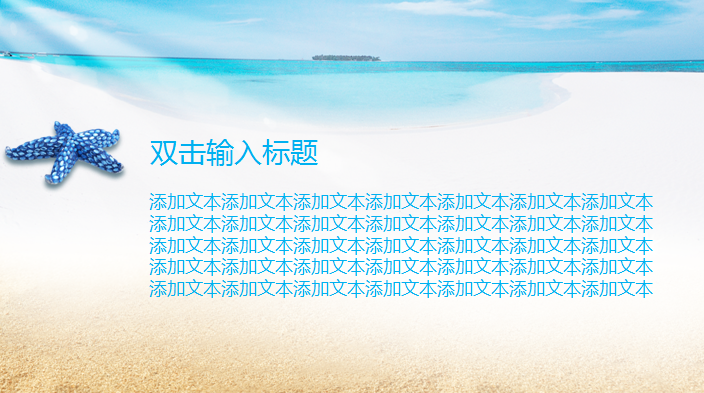 海边最常见的有沙滩,海水,海星,贝壳等,而蓝色代表一种纯净自然的美,不知道蓝色ppt模板大家看过多少呢?而今天小编和大家分享的是一个风景ppt模板,具体为唯美梦幻蓝色沙滩海星ppt模板,pptx格式,希望这个沙滩ppt模板大家会喜欢,有需要的朋友可立即下载使用。