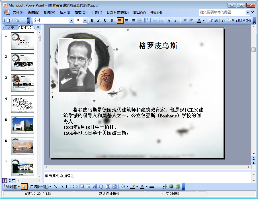 这是一份适合用来作为建筑课件的ppt,该ppt主要介绍的是世界著名建筑师及其作品代表作,该PPT共由123页组成,图文并茂,详细介绍了世界著名建筑师及其作品代表作等,如果你想对世界著名建筑师或是对世界著名建筑有更多的了解,这份PPT将会是你不错的选择,欢迎有需要的朋友下载使用!