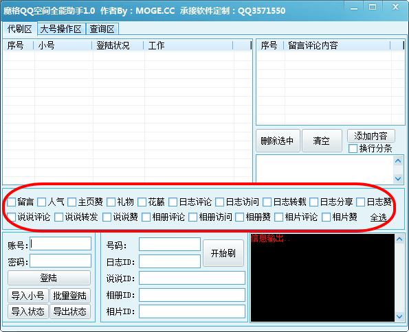 1、代刷区[18种功能]:刷留言,人气,礼物,花藤,日志赞,说说评论等