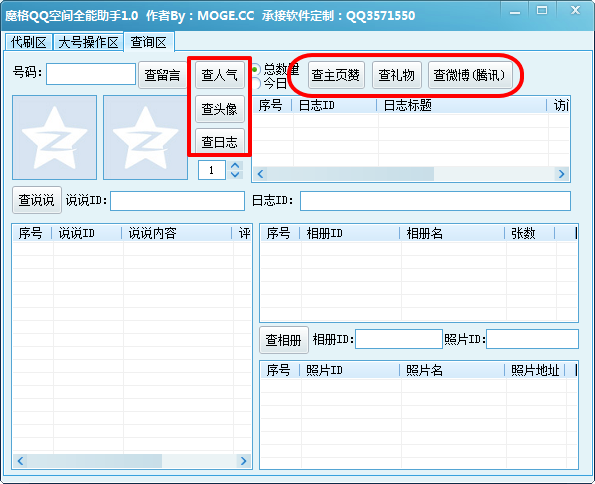 3、查询区:、查人气,查留言,查主页赞,查礼物,查微博等