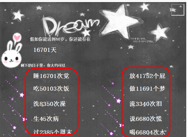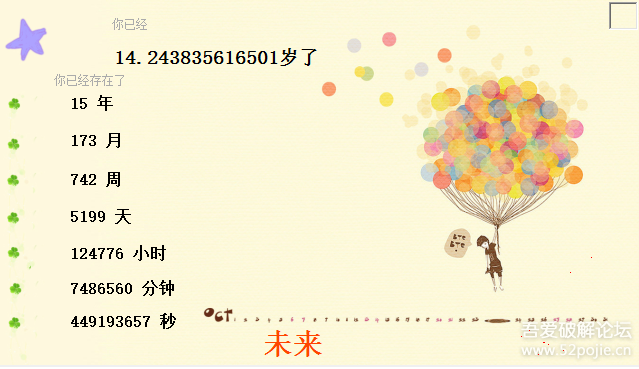 相信在很多人的眼里,正常的自己到底还能活多久,这个谁都说不准!但是现在有了吾爱破解年龄测试工具,就能够快速算出你以后的具体天数,就连你以后洗澡,生病,特别是放屁都给算出来,这真是想想都觉得好邪恶啊!此款软件自娱一些为好,不要当真!