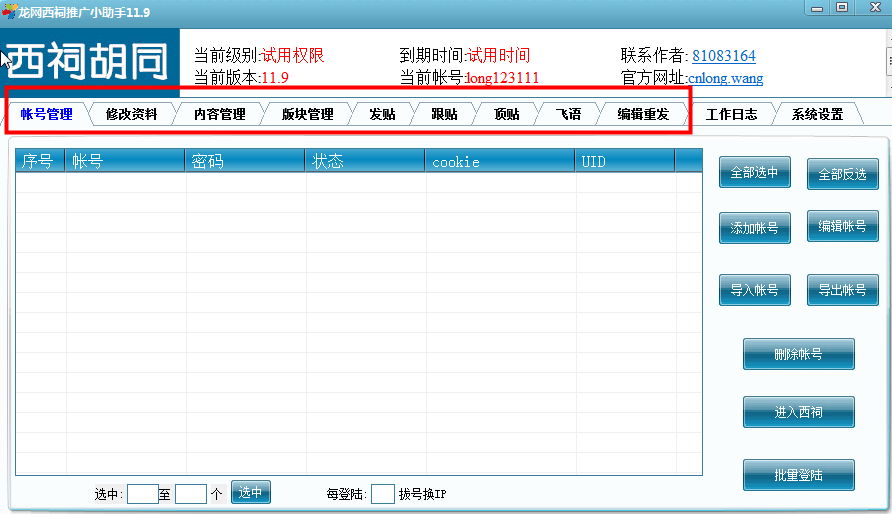 1、帐号导入,导出,批量登陆,cookie缓存独立管理,记住登陆等功能,无效帐号自动清除,全自动上传头像。