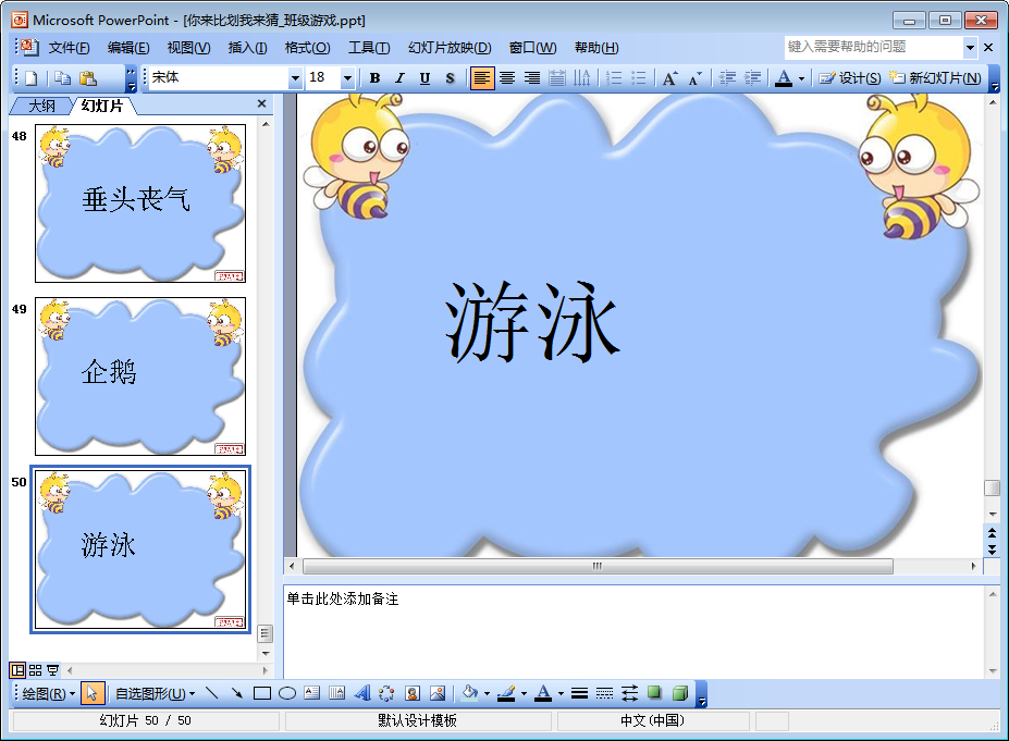 你来比划我来猜是一个非常好玩的互动游戏,这个游戏需要两个人合作,一个看着大屏幕上的词语比划、提示,另一位来大屏幕上的词语。本节内容东坡下载站为大家整理带来的便是一份适合用来在大屏幕上呈现的你来比划我来猜题目ppt,该ppt为免费版,如果你需要在班级或是工作中来玩这样一个你来比划我来猜的游戏,那么这份你来比划我来猜ppt免费下载文档将会是一个不错的选择。