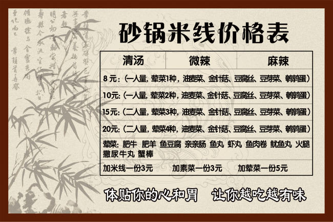 在一般的餐厅里都会有价格表展示给客户,一份精美的价格表会吸引客户的眼球,下面分享的是砂锅米线价格表psd素材,素材以中国风的竹子为背景,非常的大气有内涵,需要的朋友点击下面的地址免费下载吧。