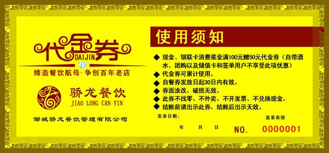 在很多的餐馆酒店里都会准备代金券,来吸引更多的客户,下面小编分享的是餐饮代金券psd模板,代金券psd模板以金色为背景,显得非常的高端大气上档次,需要的朋友们赶紧点击下面的地址免费下载吧。