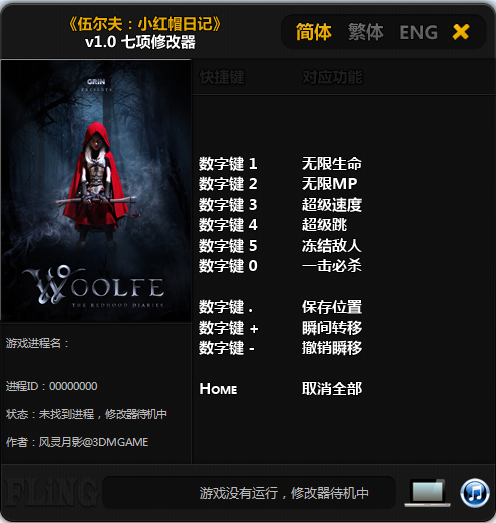 伍尔夫小红帽日记七项修改器是由3DM制作的同名游戏修改器。该修改器为中文版,玩家无需为了烦人的英文,而一个个对照说明使用。该修改器包含了无限生命、一击必杀、冻结敌人等七项功能,功能全面,也不至于太繁杂。欢迎下载!