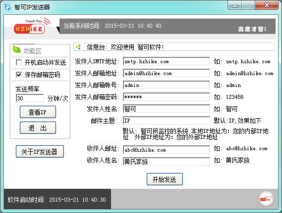 智可IP发送器可以借助链接互联网返回获取IP,并以邮件模式把IP发送到软件指定的邮箱中。该软件可以帮助一些动态站长或远程用户解决IP更换而无法操控服务器或远程计算机。可持续发送动态IP,欢迎下载!