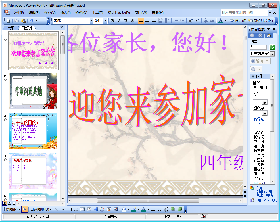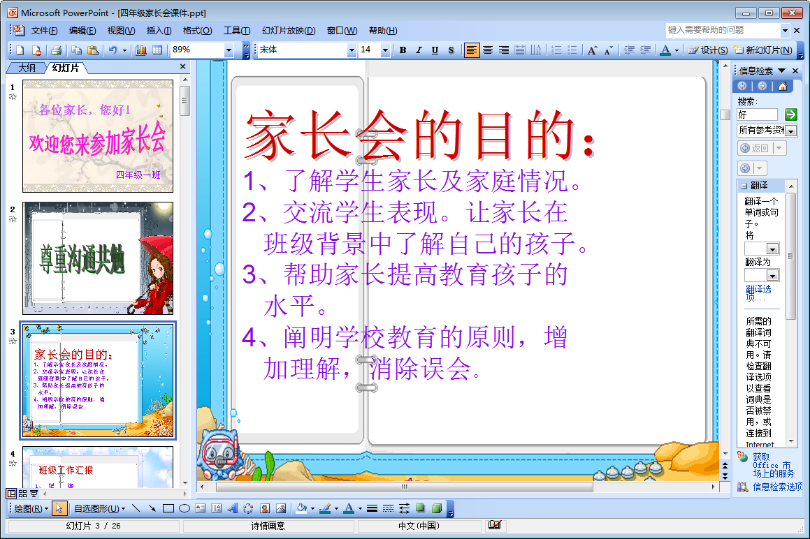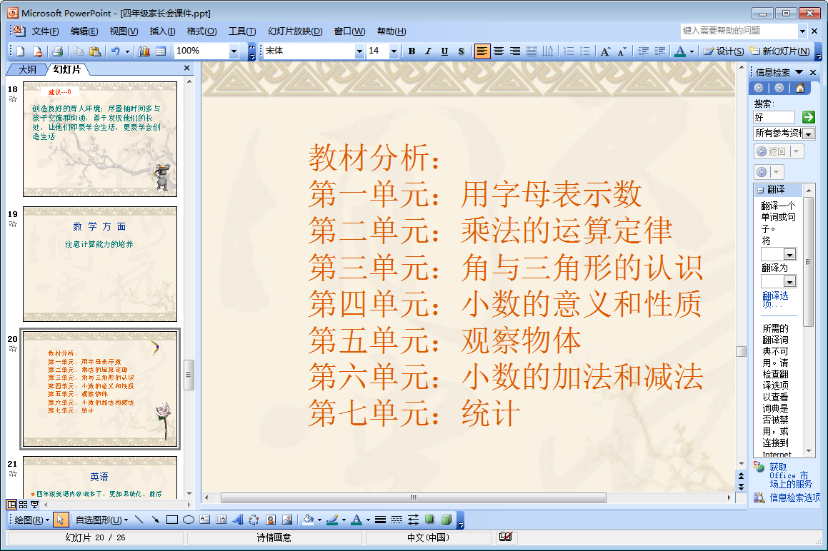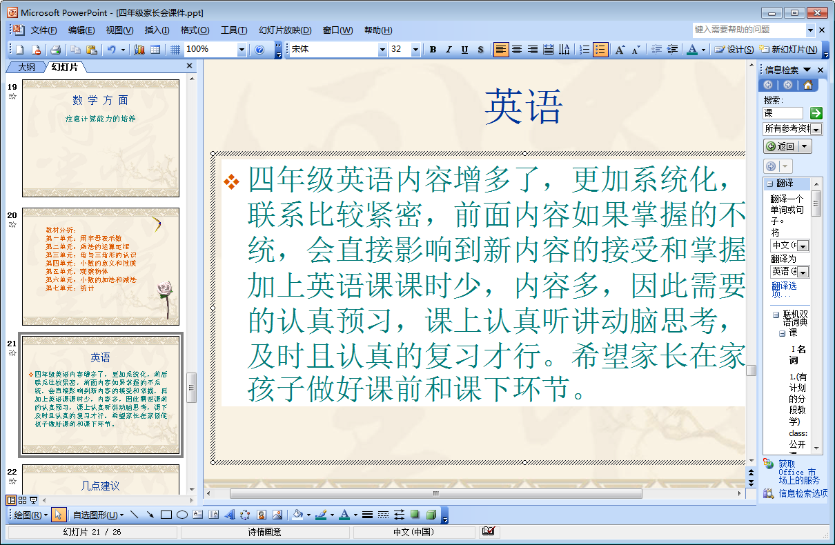 这是一份由26页组成的四年级家长会课件之四年级家长会班主任ppt——也就是四年级家长会班主任班主任发言稿——不过,是以ppt形式呈现哦!如果你需要一份四年级家长会课件ppt或是四年级家长会班主任发言ppt,那么希望这份ppt能对你有所帮助和启发,欢迎有需要的朋友进行下载使用!