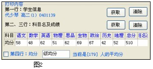 2、获取信息:在打印内容中 第二、三行右,点击[获取]按钮(如三步中的图2),下面列表中就会显示出设置的打印的科目及平均分。