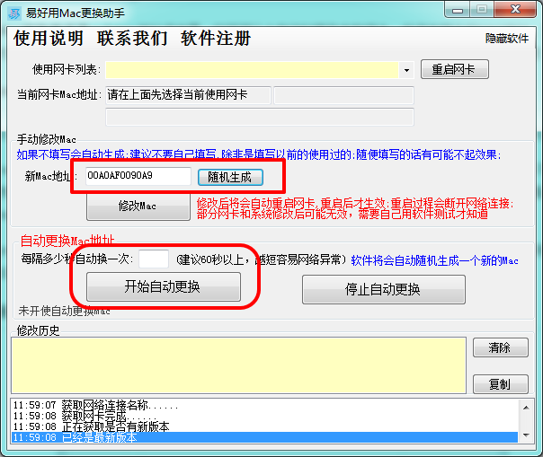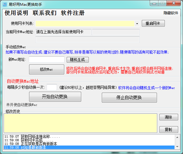 使用该软件可能会给您带来损害,因此在使用前,请先备份记录好网卡的原始mac地址,以免给您带来损害。