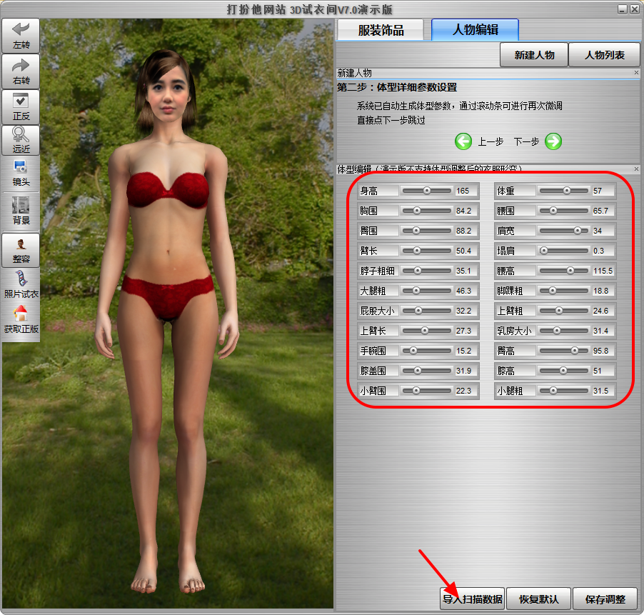 2D模式:调用本地电脑内置摄像机,拍摄用户全身照片。在此模式下,衣服、发型等配饰都是图片,可缩放、移动位置。