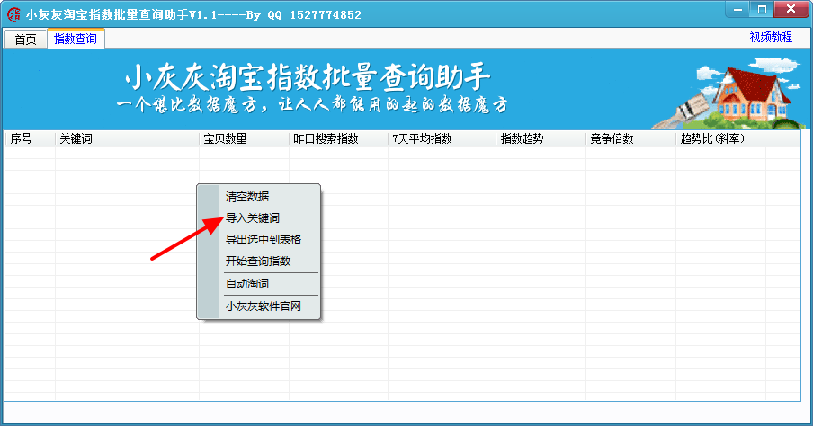 1、打开小灰灰淘宝指数批量查询助手,右键点击空白地方,导入关键词