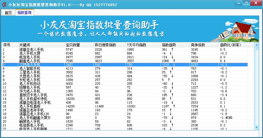 小灰灰淘宝指数批量查询助手是一款2015最新版淘宝指数查询工具。该工具绿色免费、简单易用,一键导入关键词,一键批量查询,查询准确,支持查询结果导出,绝对是你关键词优化必备之神器。欢迎下载!