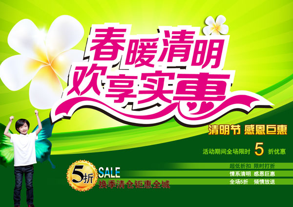 节假日人们都会出去游玩购物,现在清明节马上就要到来了,一些商家也该准备清明节额促销活动了,下面小编分享的是商场清明节宣传海报素材psd高清分层文件,海报主题是春暖清明欢享实惠,活动期间全场限时5折优惠,需要的朋友点击下面的地址免费下载这份清明节促销海报psd素材吧。