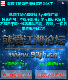 就爱江湖淘易通破解通杀补丁就算大家一直都在追捧的知名论坛“就爱江湖”最新研发成果。大家都知道淘易通的很多软件都需要进行付费,恰好这款工具就能够快速有效的进行破解,让你天天都能免费使用淘易通的各类版本的软件!