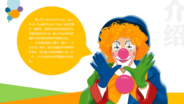 面对即将到来的愚人节大家都准备好了吗?下面小编给大家带来的是2015愚人节活动ppt动态模板,此份ppt模板封面是一个颜色鲜艳的小丑,主题是愚人节快乐,适合制作愚人节活动策划等与愚人节相关的演示,需要的朋友赶紧下载吧。