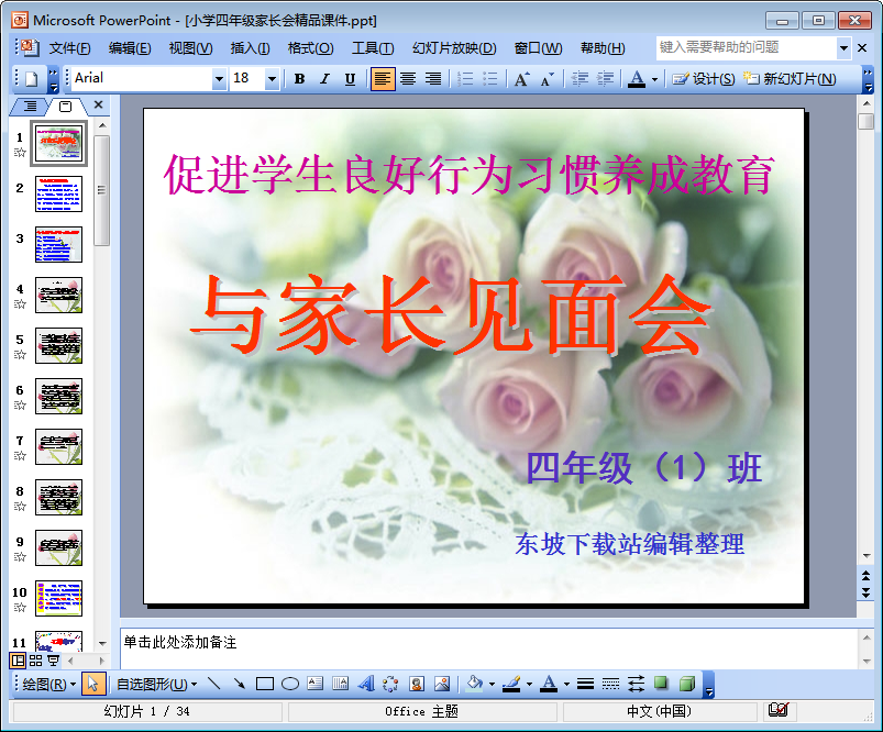 该家长会ppt课件之小学四年级家长会ppt课件共由三十四页组成,该ppt内容以促进学生良好行为习惯养成教育为主题,整个内容完整详细,逻辑清晰,是一份非常不错的家长会ppt课件,有需要的朋友点击本文下方相应的下载地址进行下载即可对该小学班主任必备课件之小学四年级家长会ppt课件进行内容的编辑和选取,欢迎下载使用!