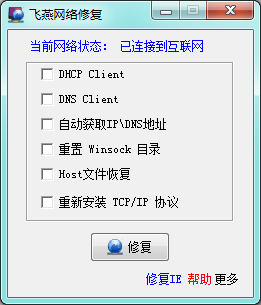有时候,电脑莫名其妙就不能联网了,在不能判断是硬件问题的时候,就只能先找找软件的原因了。飞燕网络修复,专为Win7系统定制,完美解决电脑不能联网问题,当然,硬件问题不在范围之内(硬件故障几率很小)。欢迎下载!