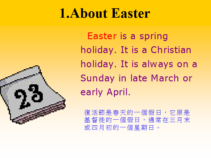年的复活节即将就要到来了,每一年的复活节日期都不固定,大家知道2015的复活节是哪一天吗?2015年复活节是4月5日,4月5日也是清明节哦!这里小编分享的是复活节介绍ppt,ppt共计35页,采用中英文的对照详细介绍了复活节的由来以及复活节相关活动,需要的朋友们点击下面的地址即可免费下载。