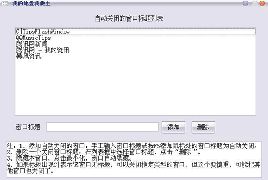 1、添加自动关闭的窗口:手工输入窗口标题或按F5添加鼠标处的窗口标题为自动关闭。