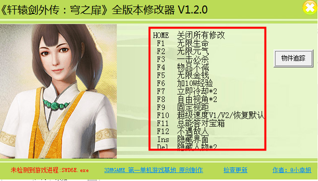 此版本新增不遇敌,隐藏界面,隐藏人物,修改器所有功能支持1.02版游戏。