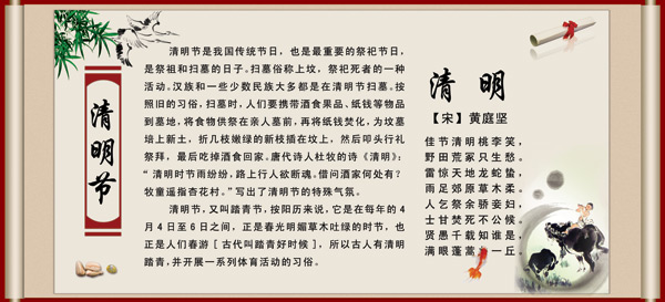清明节是中国的传统节日,在一些展示栏类都会挂上清明节宣传展板,这里小编分享的是清明节宣传展板psd素材,展板介绍了清明,附上了一首黄庭坚的一首《清明》的诗,需要清明节展板psd素材的朋友赶紧下载吧。