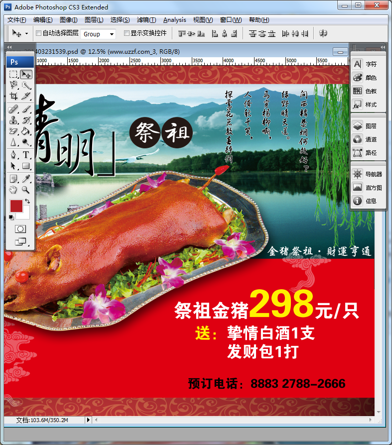 在清明节时很多朋友都会去祭祖,这里分享的是清明祭祖金猪psd广告海报素材,广告海报以江南水乡为背景,主题是一只金猪,需要清明祭祖素材的朋友赶紧下载使用吧。