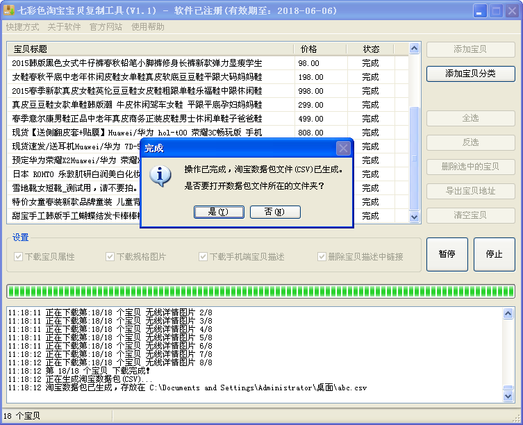 宝贝下载完成后自动生成淘宝数据包(CSV),导入淘宝助理就可以上传到自己店铺。