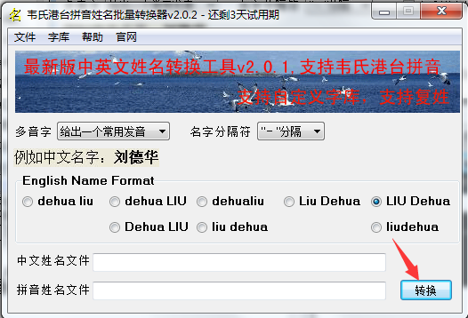 韦氏港台拼音姓名批量转换器其实就是款功能非常强大的中文姓名字体转换工具。他不但能够根据自己习惯设置出适合最适合的操作方式,而且让大家只需要输入相关的信息,就就能进行快速转换!特别适合想要学好粤语即台湾话的朋友!
