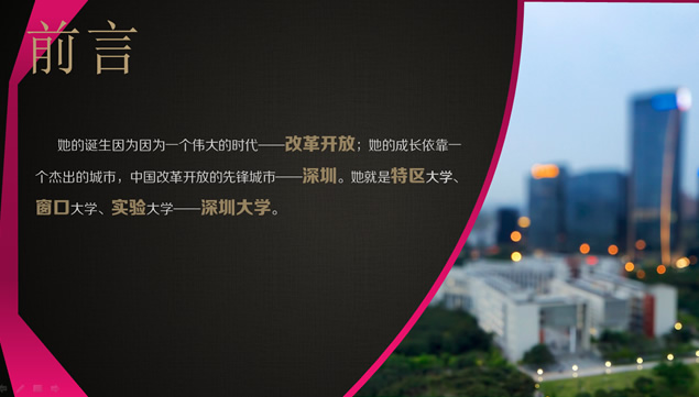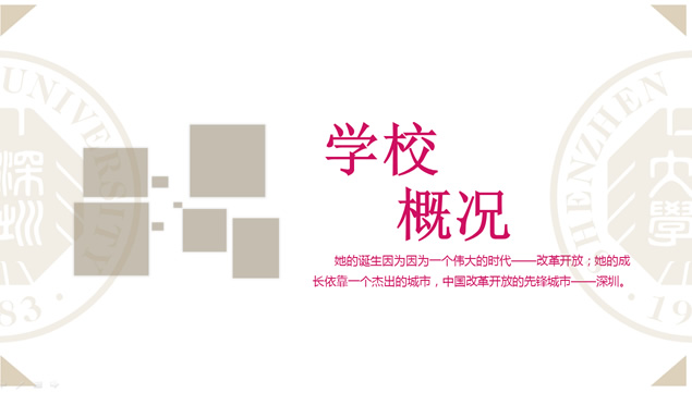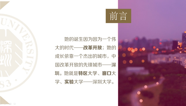 深圳大学是1983年经国务院批准创办,位于广东省深圳市南山区南海大道3688号,这里小编分享的是深圳大学校园介绍ppt模板,如果你需要关于学校宣传ppt模板,那就赶紧点击下面的地址下载使用吧!