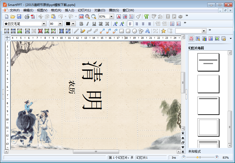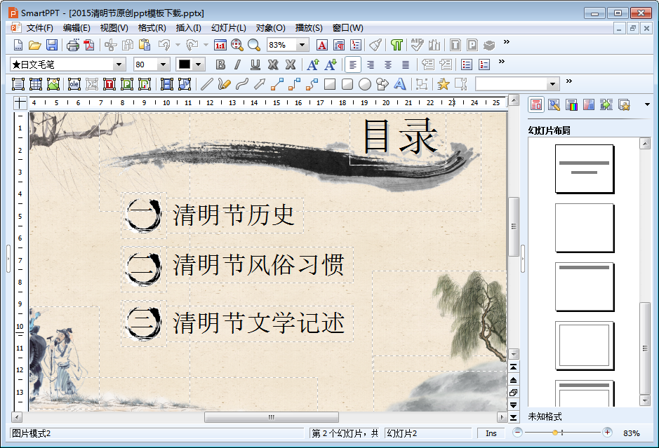 2015年的清明节近在咫尺了,除了关注2015清明节放假通知以及2015清明节高速免费吗真样的问题之外,关于清明节的来历及相关传统习俗我们也应该有所关注,本节内容小编为大家整理带来得分是一份关于2015清明节主题PPT下载文档,该清明节主题ppt课件详细介绍了清明节历史(清明节的来历介绍)、清明节风俗习惯等,欢迎有需要的朋友下载使用该清明节主题PPT!