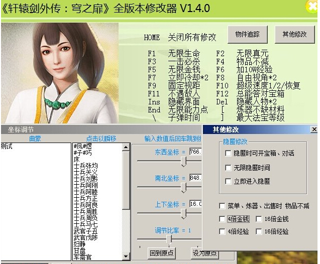 V1.4.0新增: 动态NPC追踪;识别已开宝箱/物品;子弹时间;多倍金钱/经验;菜单、炼器、出售时 物品不减。修正:上个版本不能修改个别法宝等级问题